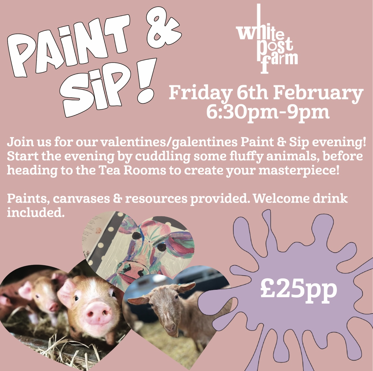 Valentine's Paint & Sip Friday 6th February 6:30 pm-9 pm Our most popular evening is back! Join us for a Valentine's/Galentine's Paint & Sip evening, where you can paint your own canvas using farm inspiration. Start your evening by meeting and cuddling some fluffy farm…