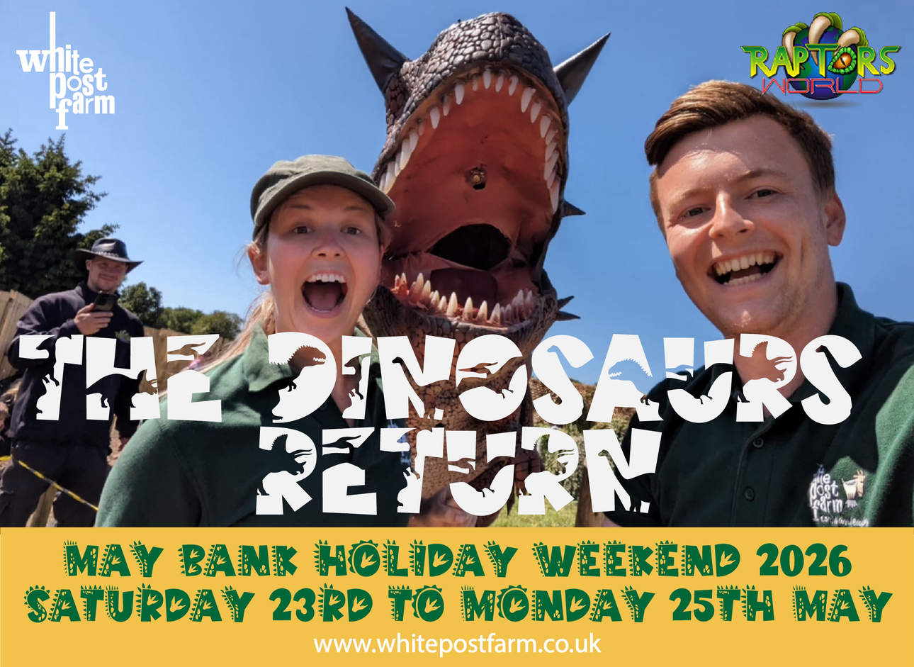 Dino Weekend: May Bank Holiday White Post Farm will be taken over by dinosaurs for the May Bank Holiday weekend! Come and see them for yourselves from Saturday, 23rd May to Monday, 25th May and join in the dino fun with Raptors World. Meet the dinosaurs,…
