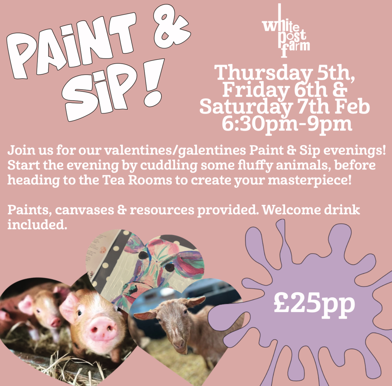 Valentine's Paint & Sip Thursday 5th February, Friday 6th February & Saturday 7th February 6:30 pm-9 pm Our most popular evening is back! Join us for a Valentine's/Galentine's Paint & Sip evening, where you can paint your own canvas using farm inspiration. Start your evening…